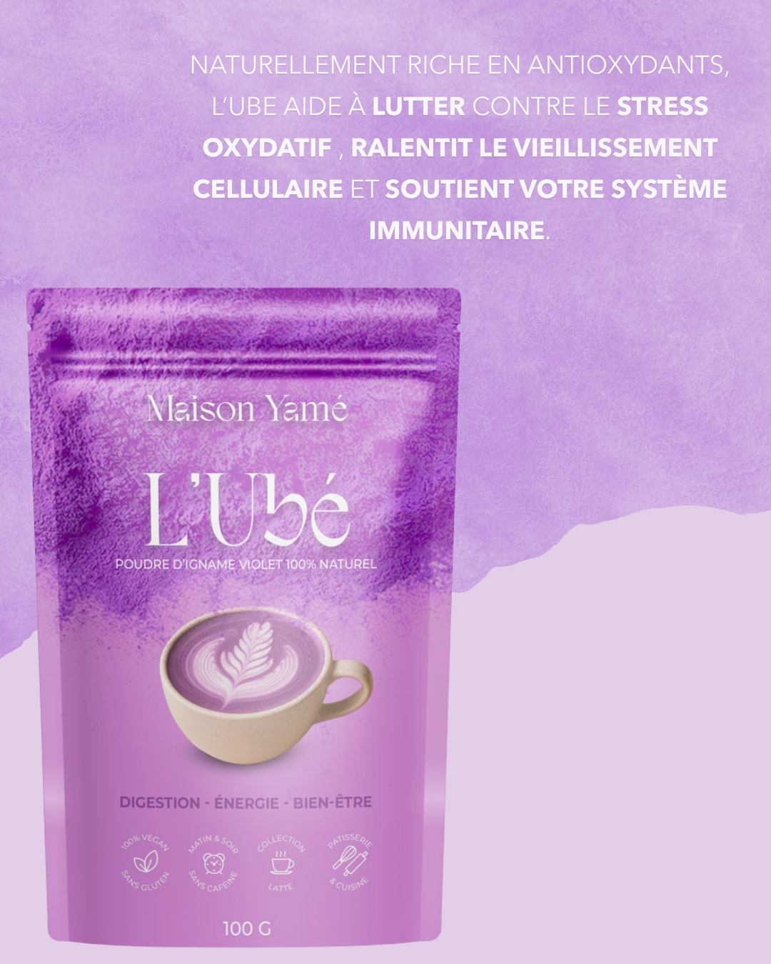 Notre ube est de qualité premium : poudre ultra fine, couleur intense, goût naturel, sans colorants ni arômes ajoutés.